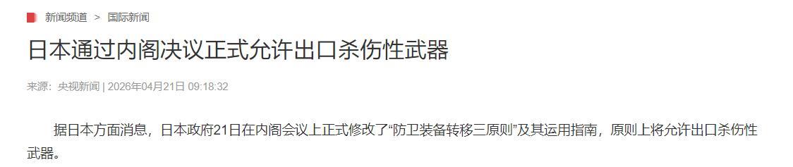 4月21日,日本内阁正式修改“防卫装备转移三原则”,日本政府进一步放宽了武器出口政策,允许向部分与日本有防务合作安排的国家出口更多类型的武器装备。