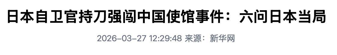 更离谱的是,2026年3月一名日本陆上自卫队军官持刀闯入中国驻日使馆,此事属严重外交与治安事件。