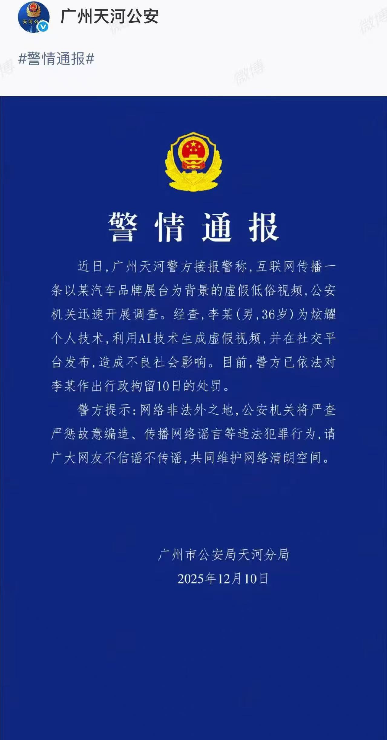 广州市天河区公安分局通报,近日,广州天河警方接报警称,互联网传播一条以某汽车品牌展台为背景的虚假低俗视频,公安机关迅速开展调查。经查,李某(男,36岁)为炫耀个人技术,利用AI技术生成虚假视频,并在社交平台发布,造成不良社会影响。目前,警方已依法对李某作出行政拘留10日的处罚。