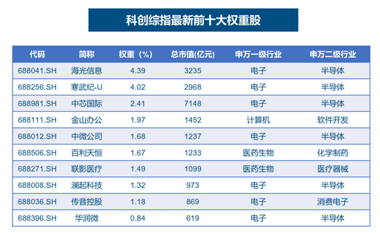 深入来看,目前上证科创板综合指数前十大成份股中“群星闪耀”,海光信息、寒武纪、中芯国际、百利天恒等一众知名科创公司均跻身其中;另一方面,前十大成份股权重合计20.97%,个股集中度较低,这也再次体现了科创综指覆盖面广而均衡的特点。