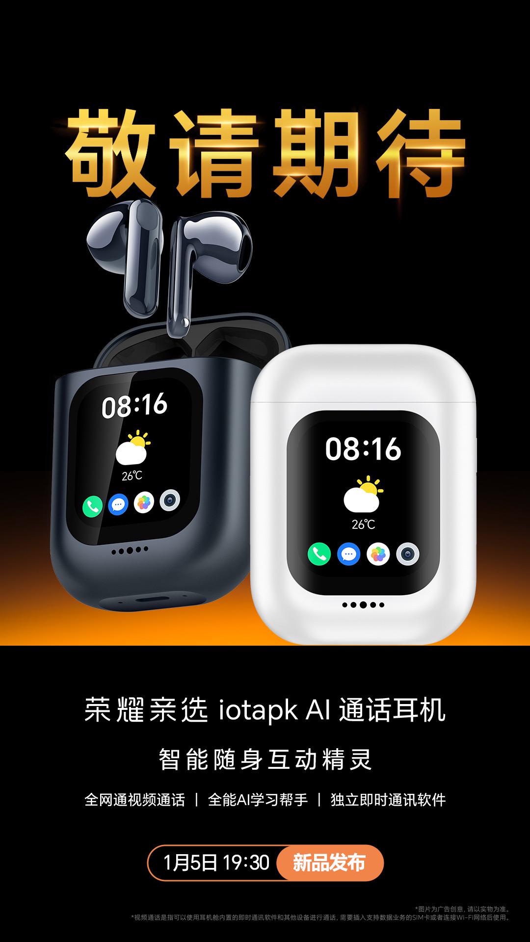 近日,荣耀亲选官宣「iotapk AI 通话耳机」,计划于明年 1 月 5 日荣耀新品发布会上正式发布,主打全网通视频通话、AI 学习和即时通讯等场景。