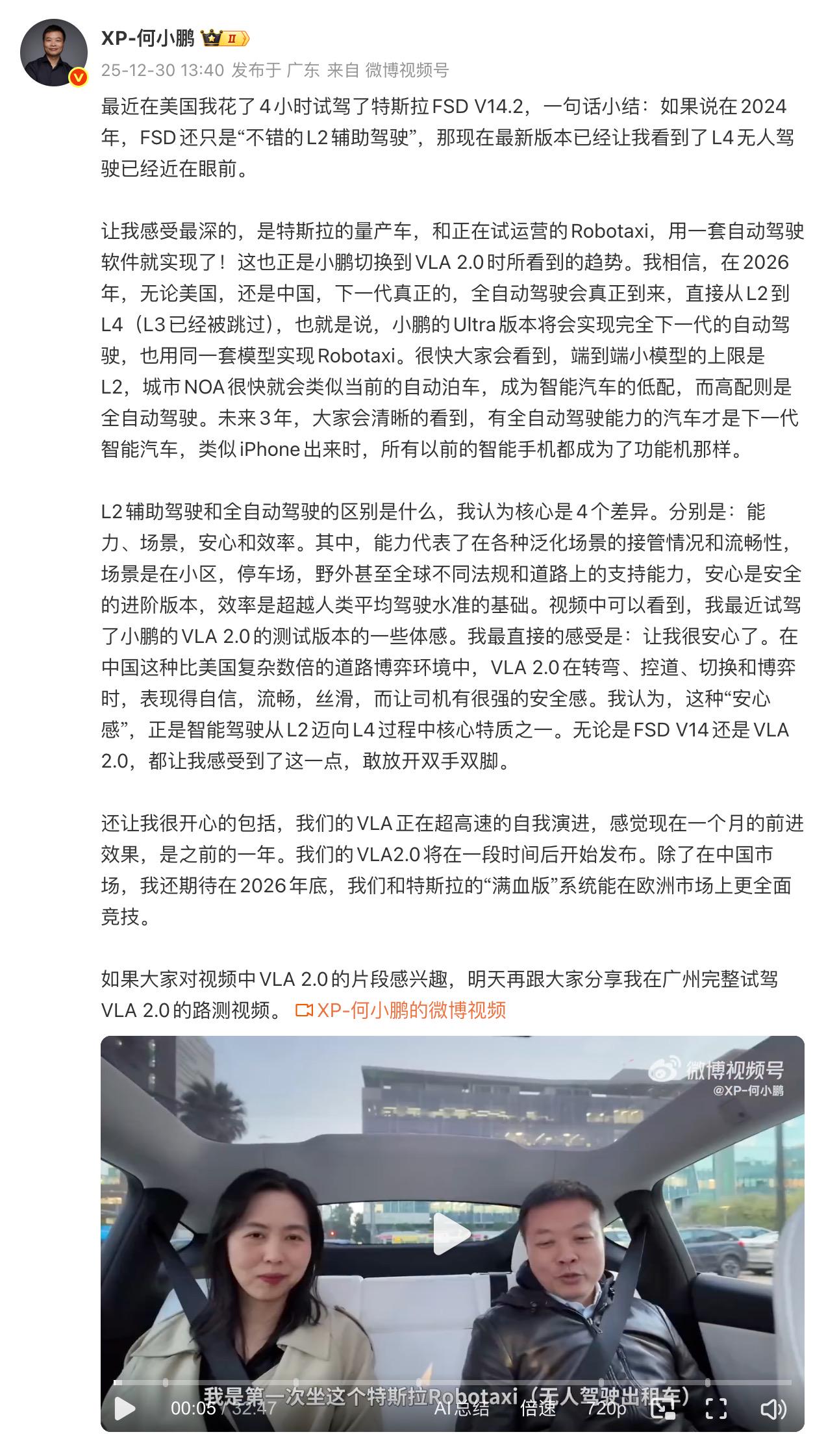 何小鹏在微博中指出,特斯拉 FSD V14.2 相比去年仍属「不错的 L2 辅助驾驶」的版本,最新迭代在泛化能力、流畅性与安全感上均有显著提升。